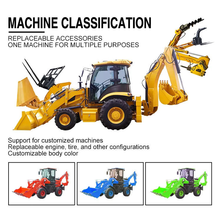 The combination of the backhoe loader, excavation and loading enables a machine to be used for various purposes to meet various construction needs. Excavation, loading, leveling and other operations to improve work efficiency. The wheeled design allows both ends to move flexibly in different terrain and complex environments. The compact structure and small turning radius facilitate easy working in a narrow space.